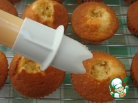 После того, как кексы остыли полностью, вырезать небольшое (1,5 см) отверстие в центре каждого кекса, удобно для этого использовать ложку для дыни или просто чайную ложку. |
