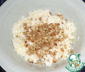 Творог размять вилкой. Добавить измельченные орехи. Перемешать.