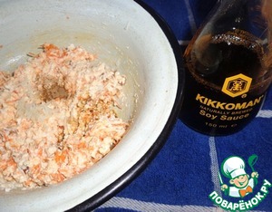 Добавляем измельченный чеснок, корицу и соевый соус. Хорошо перемешать. Начинка готова.