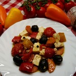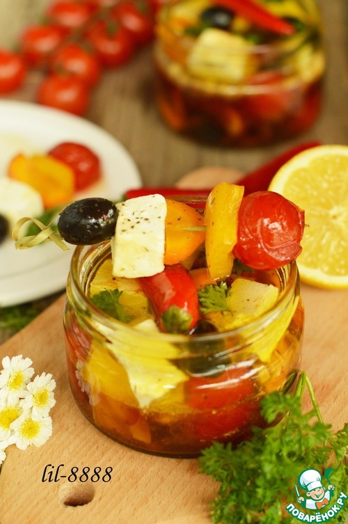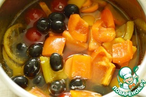 3. Выложить в маринад перец, помидоры, морковь и маслины, довести до кипения, подержать на медленном огне 1 минуту и снять с огня. Когда маринад с овощами будет теплым, добавить сыр. Аккуратно перемешать. Переложить закуску в баночки и убрать в холодильник хотя бы на сутки. А вообще. чем дольше закуска стоит, тем вкуснее становится.