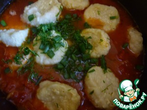 За 10 минут до готовности курицы добавляем в бульон сырные клецки и измельченную зелень.