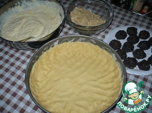 Для начинки: творог смешать с сметаной и сахаром, затем добавить яйца и крахмал при этом хорошенько перемешать. Форму с тестом и шарики достаем с морозилки, начинку выливаем в форму и по ней вдавливаем маковые шарики.