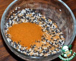 В отдельной посуде смешать сухари, кунжут и чили. Соль можно добавить на этом этапе или посыпать после уже готовые ломтики.