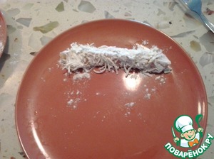 берем кусочек курочки, обмакиваем в яйцо затем хорошо панируем сыром и сверху мукой -