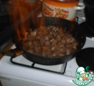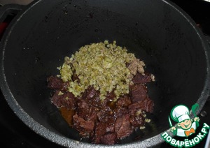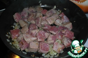 4. Добавляем мясо, увеличиваем огонь до сильного и жарим, помешивая, примерно 10 минут.