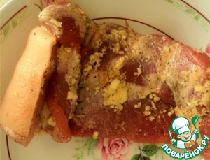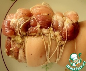 Плотно сворачиваем рульку рулетом. Я советую привлечь к этому делу рукастого помощника. Перевязать получившийся рулет крепкой нитью и оставить пропитываться и насыщаться спечиями часа на 2.