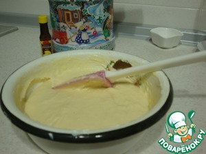 В полученную массу влить сыворотку со сметаной и размешать.