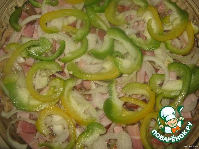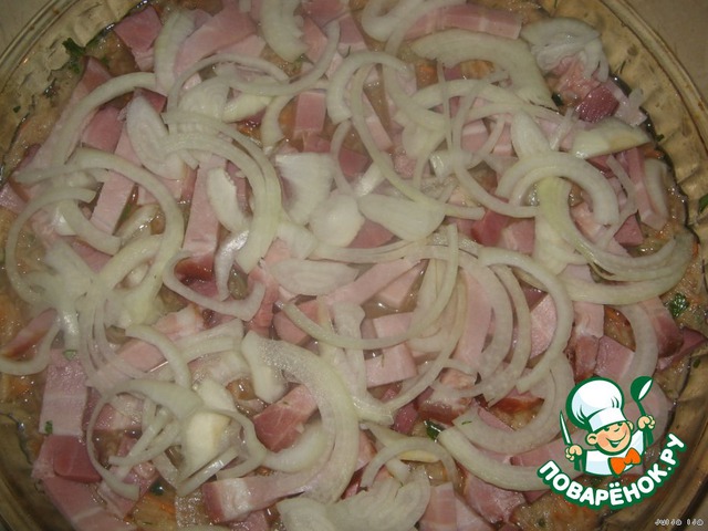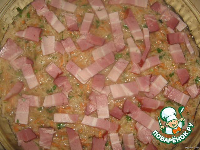 Нарезаем бекон соломкой, выкладываем поверх массы.