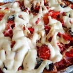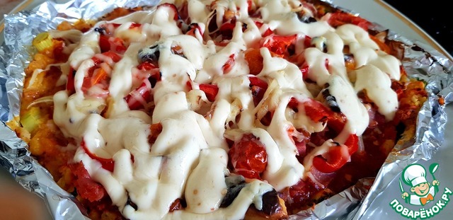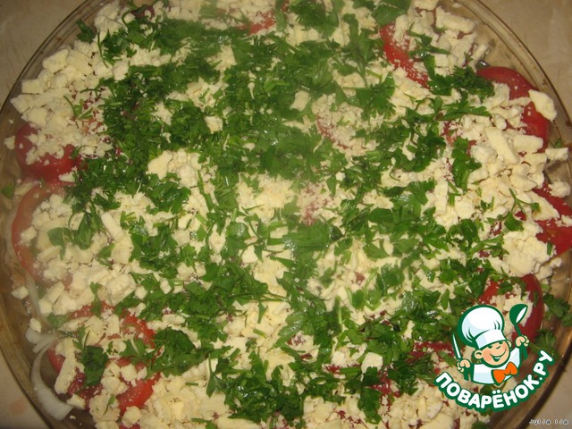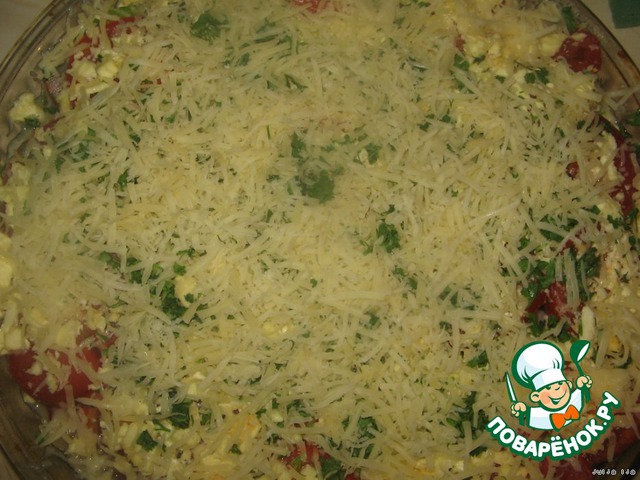 Помидоры нарезаем кружочками и выкладываем по всей поверхности (забыла этот шаг сфотографировать). Поверх помидоров выкладываем сыр. У меня было два вида - первый слой брынза.