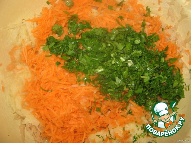 Сливаем лишнюю жидкость. Нарезаем зелень.