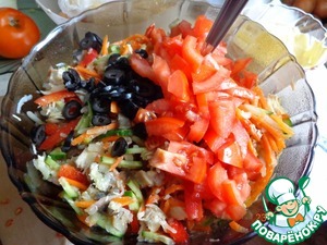 Нарезаем одну помидорку и маслины. Маслины я брала без косточек.