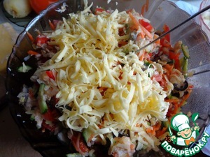Картофель и мясо нарезаем ( у меня картофель натерт на терке, но методом проб и ошибок понимаю теперь, что лучше нарезать, так вкуснее). добавляем все в салатник.
