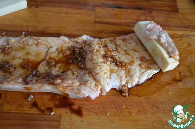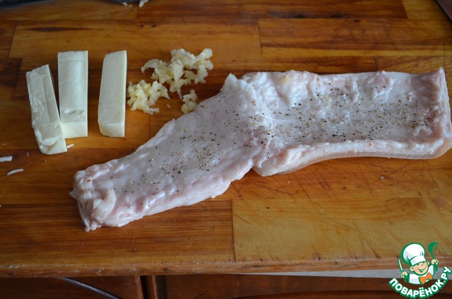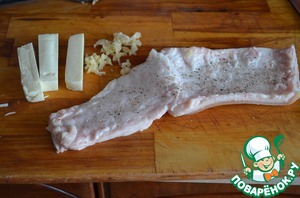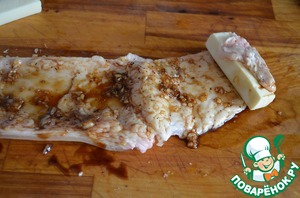 Кусок сала осторожно разрезаем книжкой (посередине пласта разрезаем сало, не дорезая до конца, чтобы его можно было раскрыть). Плавленый сырок порежем палочками. Чеснок раздавим на чеснокодавке.