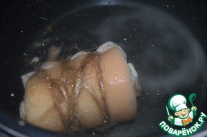 Закрепляем рулет шпагатом и ставим вариться в слегка подсоленной воде 1-2 часа. Я варю в скороварке 1час.