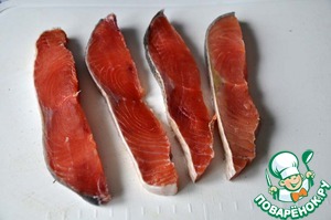 Лосось, у меня кета, разделываем на филе, кости удаляем, оставляем шкуру.