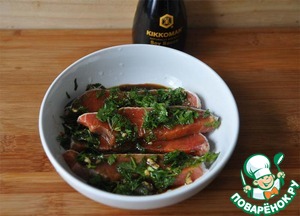 Готовим маринад. Берём соевый соус от ТМ Киккоман, добавляем измельчённый чеснок, мелкопорубленную зелень (у меня кинза и укроп), оливковое масло и свежемолотую смесь перцев.