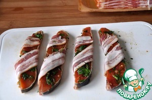 Каждое филе лосося заворачиваем в полоску сырокопчёного бекона.