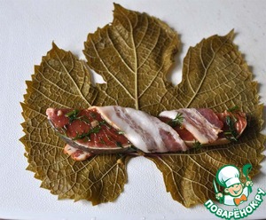 Берём лист винограда шершавой стороной вверх, с краю кладём филе лосося в беконе.