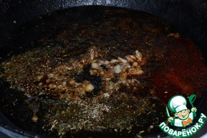 В это время на сковороде разогреваем соевый соус и растительное масло с 3 зубчиками порезанного чеснока. Добавляем специи. На 3 минуты высыпаем морской коктейль, добавляем соль. Огонь выключаем, сливаем соус.