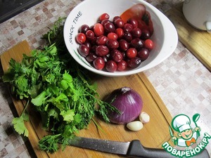 Подарок мясоедам. Очень люблю соус "Ткемали" к мясу, но алыча у нас бывает редко и недолго. Зато клюква в наших северных краях бывает круглый год и в свежем, и, уж, тем более, замороженном виде. Попробовала на основе рецепта ткемали сделать клюквенный дип к мясу. Получился очень необычный соус. Любителям необычных сочетаний рекомендую попробовать. Выход: 100 грамм