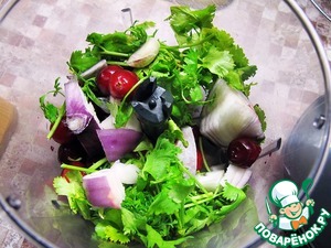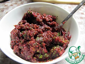 Пропустить клюкву, зелень, лук, чили и чеснок через блендер. У меня была польская мороженая клюква, суховатая по сути. Поэтому дип получился похожим на джем. С обычной клюквой он будет более жидким.