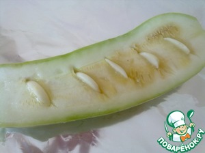 • На кабачках делаем надрезы и вставляем в них порезанный дольками чеснок.