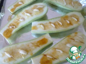 Поливаем кабачки приготовленным соусом. На мелкой тёрке натираем сыр и посыпаем им кабачки. Противень застилаем фольгой, выкладываем кабачки и ставим в духовку на 25 минут при температуре 180 градусов.