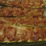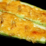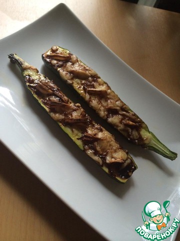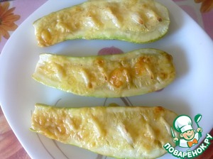 • Поливаем кабачки приготовленным соусом. На мелкой тёрке натираем сыр и посыпаем им кабачки. Противень застилаем фольгой, выкладываем кабачки и ставим в духовку на 25 минут при температуре 180 градусов.