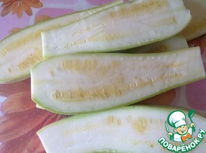 • Моем кабачки, отрезаем концы с двух сторон и режем их продольно пополам.