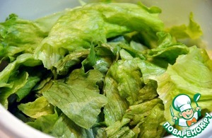 Салат помоем и произвольно порвём листья. Переложим в контейнер и слегка помнём их.