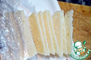 Сыр нарежем очень тонкими ломтиками.