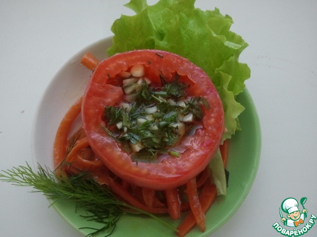 Эти помидоры - не заготовка, а отличнейшая закуска. Особенно любима мужчинами. Готовится очень просто, а результат потрясающий! Взять её на пикничок, под шашлычок, да под водочку... просто необходимо!