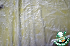 Смазанные листы теста произвольно рвём, комкаем и произвольно выкладываем на поверхность пирога.