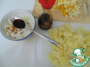 Лук порезать тонкими полукольцами, залить кипятком на 2 минуты, воду слить, в лук влить соевый соус, оставить на 5 минут.