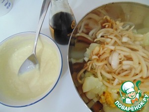 Приготовить заправку: смешать майонез, натуральный йогурт и горчицу.