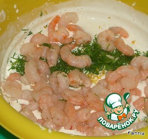 Пока камбала маринуется, приготовить начинку. Креветки отварить и очистить. Если они свежемороженые (розового цвета) - просто разморозить. Укроп вымыть, обсушить и мелко нарезать. С лимона снять теркой цедру. Сыр размять вилкой, взбить в блендере со сливками. Смешать в миске сыр, укроп, цедру лимона и соль. Добавить креветки, перемешать начинку легкими движениями.