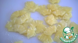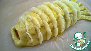 В отверстия между полосками вставляем пластинки ананаса, имитируя рыбную чешую.