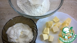 Тесто будем делать в комбайне. Просеянную муку соединяем с разрыхлителем, солью, и размягченным сливочным маслом, добавляем сметану.