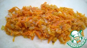 Нарезаем мелко лук, морковь натираем на крупной терке. В сковороде разогреваем растительное масло и обжариваем в нем до прозрачности лук. Добавляем морковь и обжариваем до золотистого цвета. Остужаем.