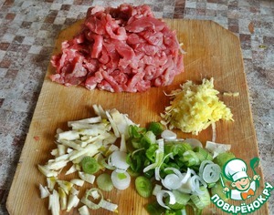 Вместо телятины можно взять говяжью вырезку. Главное, чтобы мясо быстро сготовилось, его нужно порезать, чеснок тоже мелко порезать. Так же поступим и с зелёным луком. Имбирь натереть на мелкой тёрке.