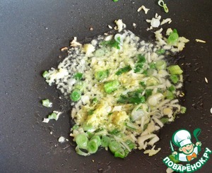Прогреть масло на сковороде и положить лук, имбирь, кайенский перец и чеснок, жарить помешивая минуты 2-3.