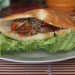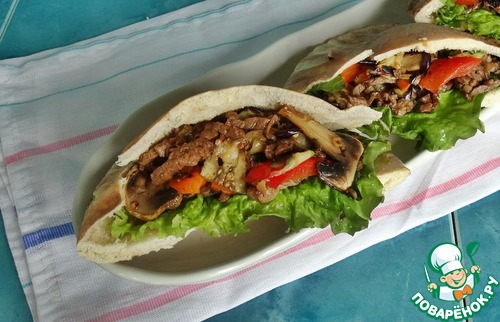 Разрезать питы пополам и положить внутрь мясо с овощами.