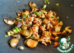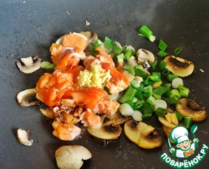 Разогреть масло в сковородке и положить грибы, лук, имбирь и рыбу. Жарить до готовности рыбы.