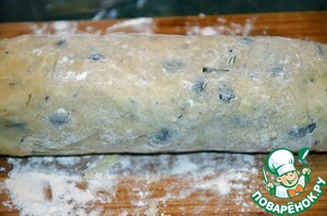 Добавим муку, масло комнатной температуры и вымесим тесто. При необходимости можно чуть добавить ледяной воды. Поперчим и скатаем в колбаску.
