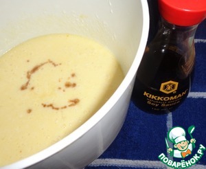 Добавляем соду, соевый соус, щепотку соли по вкусу.