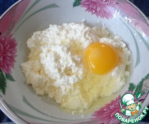 К творогу добавляем яйцо и сахар. Перемешиваем.