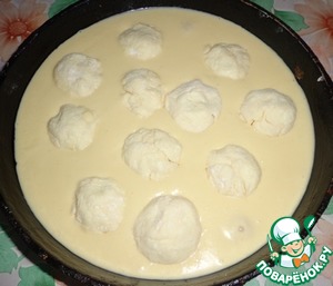 Тесто выливаем в форму, смазанную растительным маслом. Кладем в тесто творожные шарики.