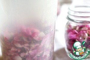 Соцветия роз должны быть упругими и цветущими. Оборвать лепестки и обрезать белую часть. В данном случае я использую 500 г. по объёму (насыпом, не утрамбовывая).