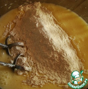 Добавляем муку с разрыхлителем и ванильным сахаром. ПРодолжаем вымешивать миксером на маленькой скорости до однородного состояния теста.