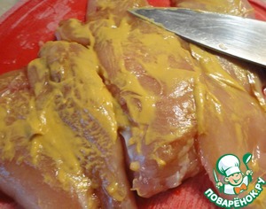 Смазываем горчицей. Я люблю острое, поэтому горчицу взяла жгучую. Вы берите по своему вкусу.